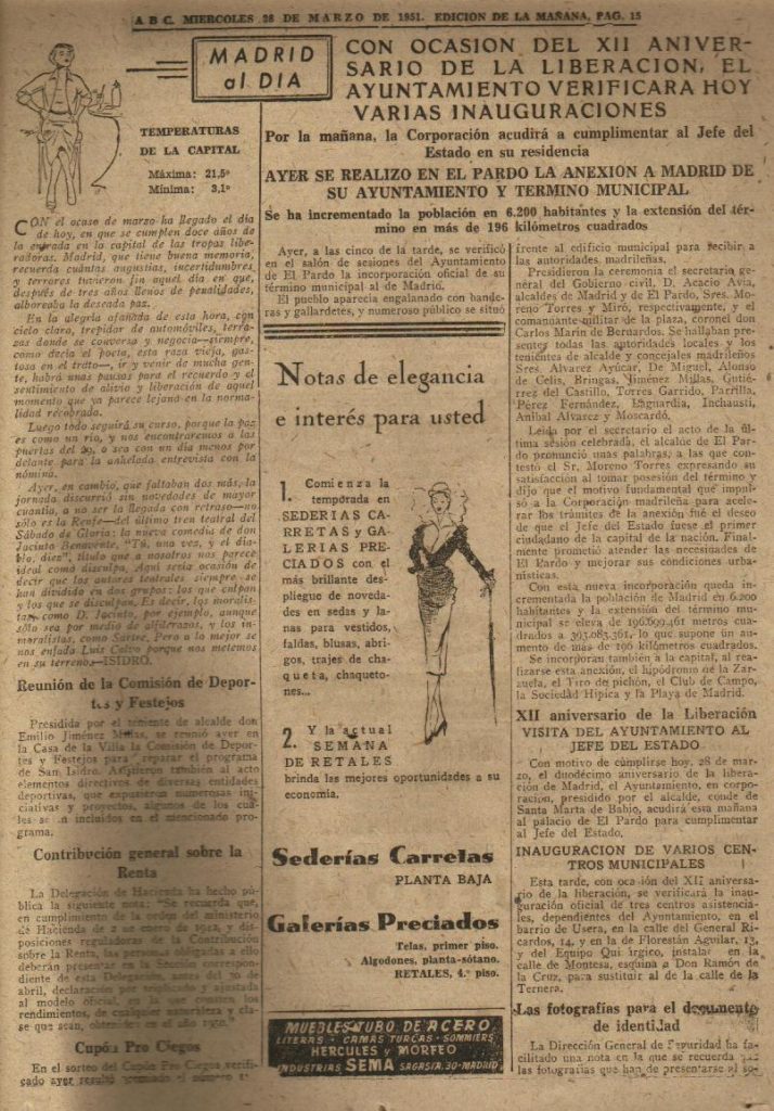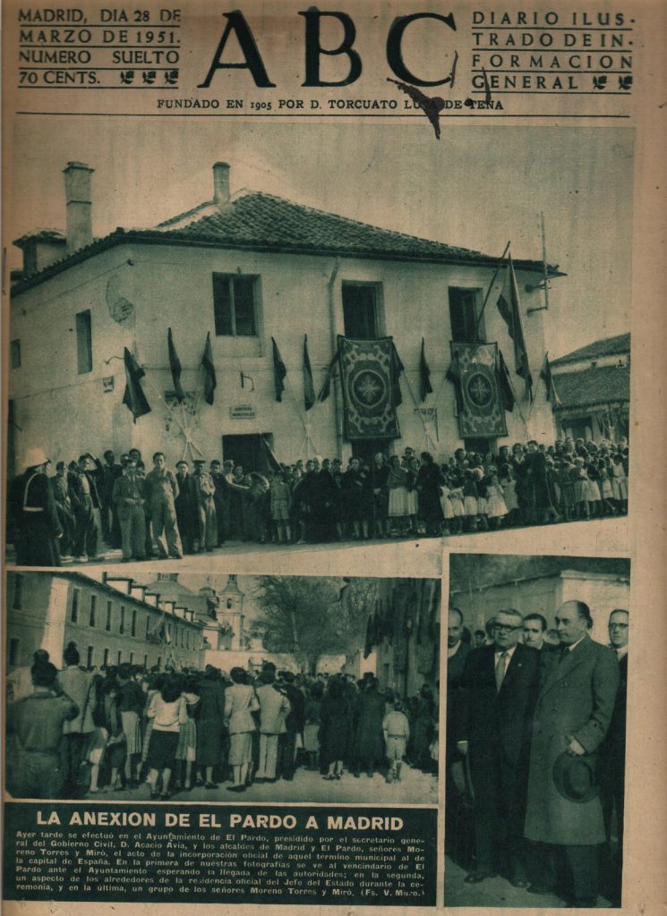 El próximo día 21 de marzo recrearemos desde las 11 de la mañana el acto público de la firma del acuerdo de anexión del municipio de El Pardo a la ciudad de Madrid. En este evento, que ocurrió en marzo de 1951, las autoridades de ambos municipios firmaron, en presencia de numeroso público, autoridades y famosos del momento. Este próximo mes de marzo se cumplen, por tanto, los 75 años de la anexión. La junta de distrito de Fuencarral-El Pardo quiere celebrar esta efemeride con una recreación histórica de la firma de este acuerdo.